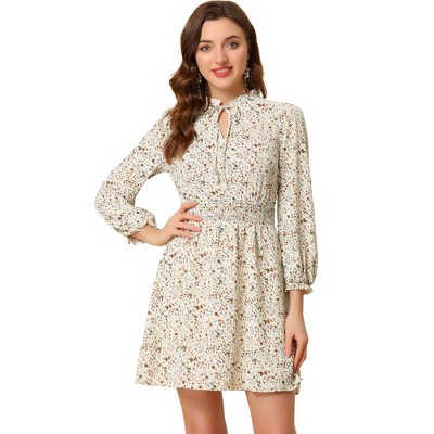INSPIRE CHIC Women's Smocked Waist Tie Neck Floral Long Sleeve Dress