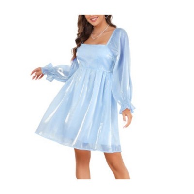 Women'S Square Neck Babydoll Mesh Long Sleeve Dress