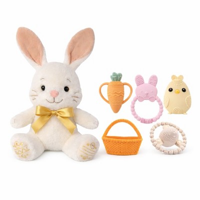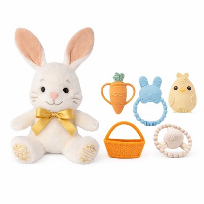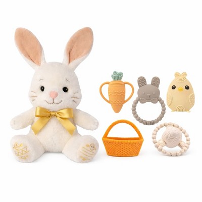 Easter Plush Bunny & Silicone Teether Toys Set, Soft Easter Stuffed Bunny Plush Toy with Bow, 5-Pack Easter Teether Toys, Easter Gift Set for Babies