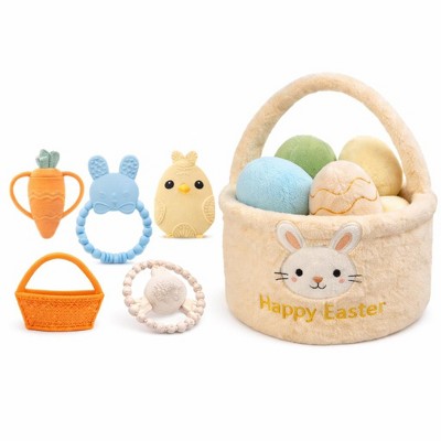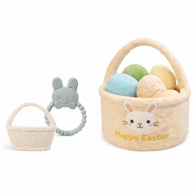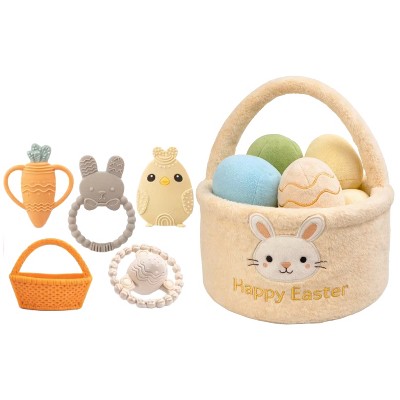 Easter Egg Plush Basket with Easter Baby Teether Toy Set, 5 Pack Easter Teething Toys & Soft Easter Egg Basket Toy, Perfect Easter Gift Set for Babies