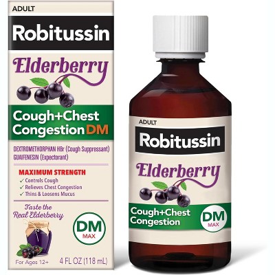 Robitussin Adult Cough, Chest & Congestion DM Syrup Elderberry, Cough Suppressant & Expectorant Formula, 4 oz