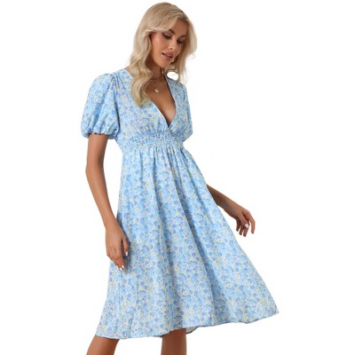 Allegra K Women's Floral Deep V Neck Smocked Waist Casual Summer Midi Dress