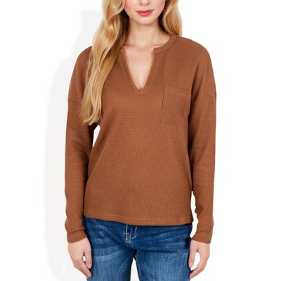 Anna-Kaci Women's Long Sleeve Waffle Knit Top with Notched Neckline and Chest Pocket