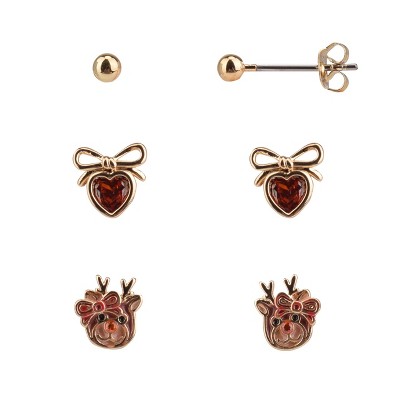 FAO Schwarz Gold Tone Reindeer and Heart Trio Earring Set