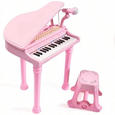 Key Piano Toy Birthday Gift for , Pink Musical Piano with Microphone and Stool