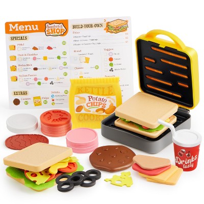 Joyfy Kids Pretend Play Kitchen Toy, Panini Maker & Sandwich Set with Slicer, Ingredients & Menu, Play Food Toy for Toddlers & Girls Birthday Gift