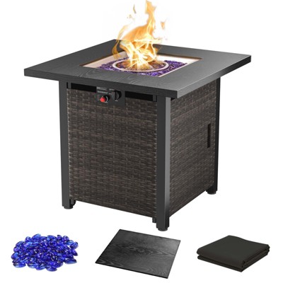 28" Outdoor Propane Fire Pit Table, 50,000 BTU Square Gas Fire Table with Lid & Glass Stones, 2-in-1 Rattan Patio Firepit for Backyard, Deck