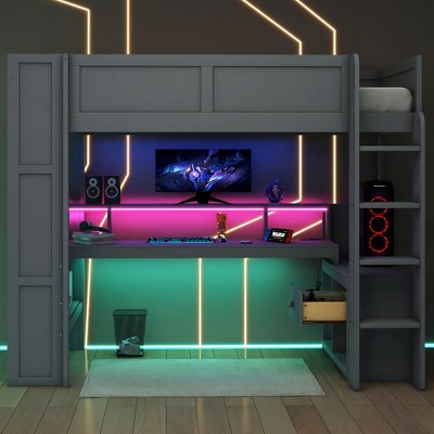 Polibi Full Size Bunk Bed with Trundle, Built-In Desk, Shelves, and Cabinet