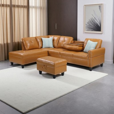 L-Shaped 3-Piece Sectional Sofa with Storage Ottoman & Cup Holders
