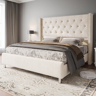 AMERLIFE Bed Frame with 51.2" Tall Upholstered Headboard and Four Poster Design