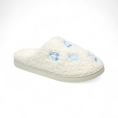 Aéropostale Women’s Fuzzy “Cherry-Bow” Mule Slippers – Ivory Slip-On House Shoes with Sky-Blue Cherry-Tie Embroidery & Non-Slip Outsole
