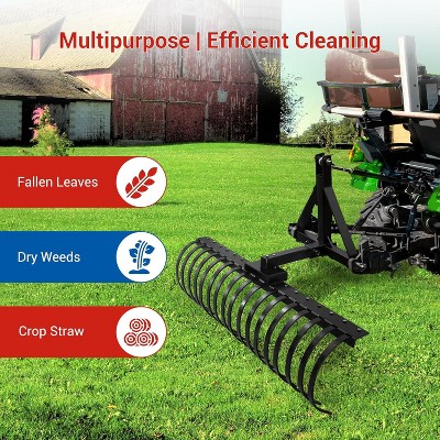 - garvee 60 inch landscape rock rake,3 point attach rake fit for 2 inch receiver with 360 degree rotation,tow-behind garden tool for compact tractors, category 1 reviews
