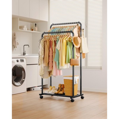MOEPISY Double Rods Clothing Rack with Mesh Shelf, Hooks & Wheels