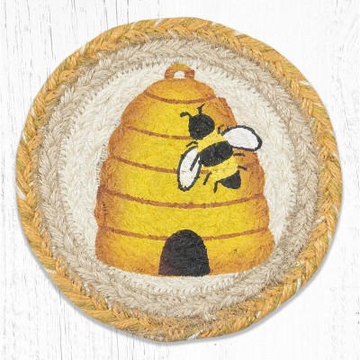 Earth Rugs Round Large Coaster – Beehive and Bees Design, Braided Jute, Rustic Nature-Inspired Accent, 7"x7" Table Mat