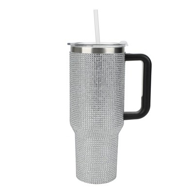 Bioworld Silver Rhinestone 40 Oz Vacuum Insulated Stainless Steel Tumbler with Leak-Proof Lid & Easy Carry Handle, Sparkling Finish for Travel or Home