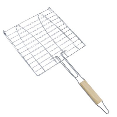 Unique Bargains Wooden Handle Metal Mesh Folder Barbecue Grill Silver 1 Pc