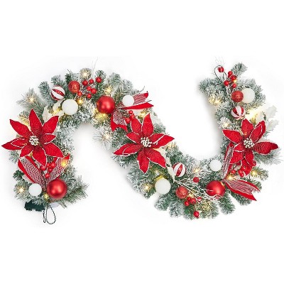 Christmas Garland for Fireplace, 6ft Pre Lit Xmas Garland with Artificial Flowers Pinecones Ball Ornaments for Mantle Fireplace Stairs