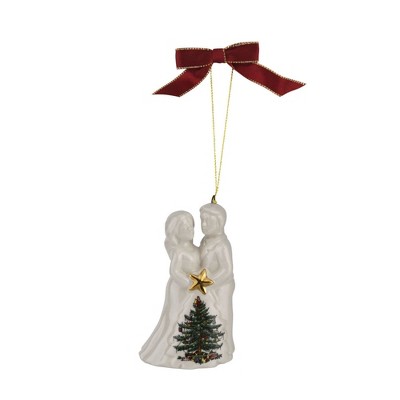 Spode Christmas Tree Bride & Groom Ornament, Festive Holiday Bauble for Christmas Tree, Earthenware Hanging Decoration with Red Ribbon