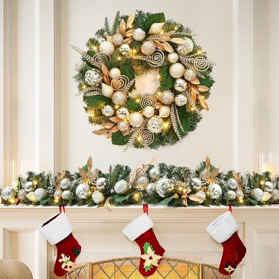 24" Christmas Wreath with Lights for Front Door, Pre-Lit Christmas Wreath, Lighted Xmas Door Wreath with Ball Ornaments for Christmas Decor