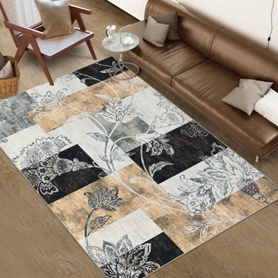 Washable Floral Living Room Rugs, Distressed Vintage Retro Accent Throw Carpet for Bedroom Dining Room Office