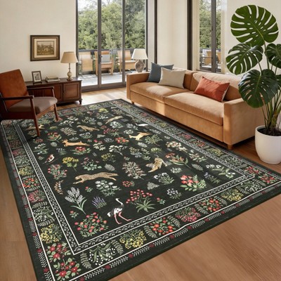 Washable Rug Farmhouse Rug with Non Slip Rubber Backing, Botanical Animal Print Carpet