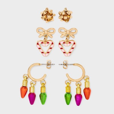Christmas Bow and Heart Candy Cane Mixed Hoop Earring Set 3pc - Gold