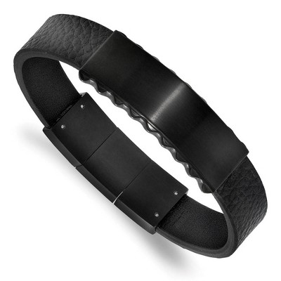 Black Bow Jewelry Black Plated Stainless Steel Black Leather Adj. I.D. Bracelet, 7.75 In