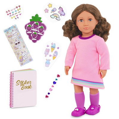 Our Generation Finley 18" Doll with 50+ Stickers & Sticker Book Set: Fashion and Beauty, Light Brown Hair, Purple Eyes