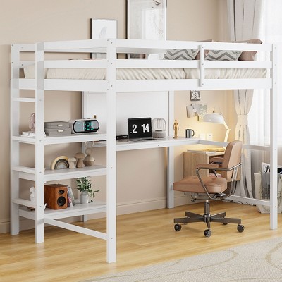Twin Size Wooden Loft Bed with Shelves, Desk, and Writing Board