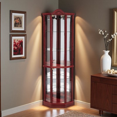 Lighted Corner Curio Cabinet with Glass Shelves, Carved Wood Detail and LED