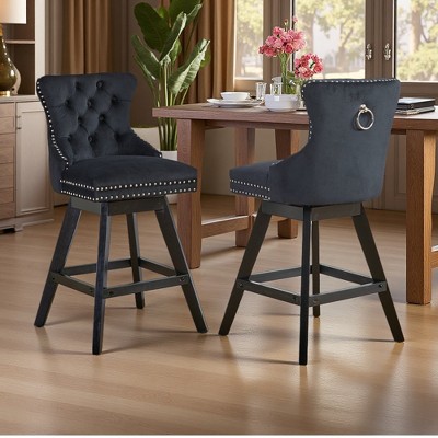 Swivel Velvet Bar Stools with Button Tufted Seat & Wood Legs, Set of 2
