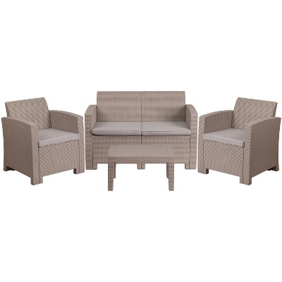 Flash Furniture 4 Piece Outdoor Faux Rattan Chair, Loveseat and Table Set in Light Gray