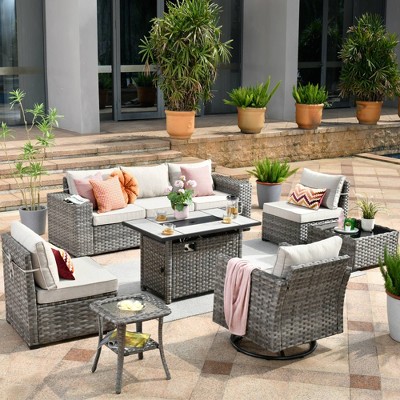 Marlton 9pc Wicker Outdoor Fire Pit Patio Furniture Set Conversation Sofa with a Swivel Chair and Cushions