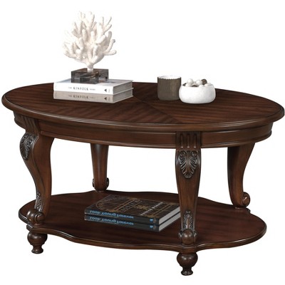 42" Oval Wood Coffee Table, 2-Tier Solid Wood Cocktail Table, Antiqued Two-Tone Finish, Open Storage Shelf, Cherry-- Frevyn
