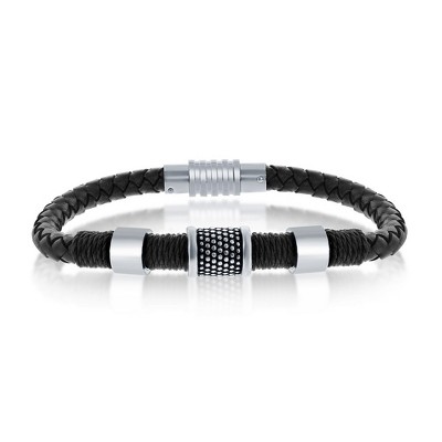 Steeltime Men's black leather braided bracelet with stainless steel accents