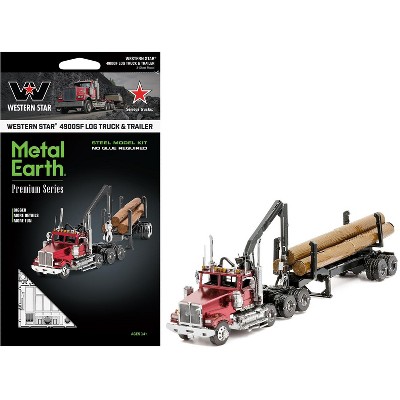 Western Star 4900 Log Truck and Trailer Red Metallic (Challenging Difficulty) Steel Model Kit by Metal Earth