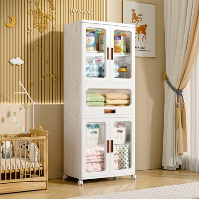 VECELO Stackable Storage Bins with Adjustable Shelves & Lockable Wheels, Storage Cabinet Home Organizer with Drawers & Doors, White