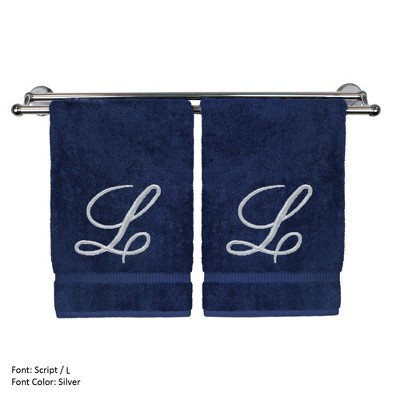 BC BARE COTTON Monogrammed Hand Towel, 100% Turkish Cotton - Set of 2 - Navy - Silver Script