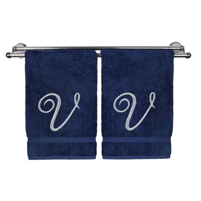 BC BARE COTTON Monogrammed Hand Towel, 100% Turkish Cotton - Set of 2 - Navy - Silver Script