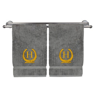 BC BARE COTTON Monogrammed Hand Towel, 100% Turkish Cotton - Set of 2 - Gray - Gold Wreath