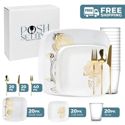 Posh Setting 140 Piece White And Gold Plastic Party Bundle - Peony (20 Settings)