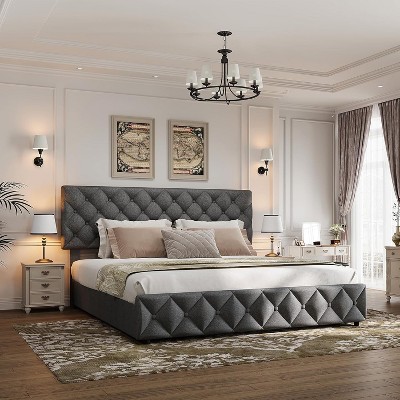 Full Size Bed Frame with 4 Storage Drawers & Headboard,Linen Upholstered Platform Bed Frame,Stylish Diamond Tufted Design, No Box Spring Needed |Grey