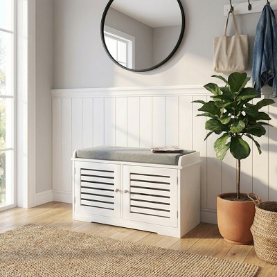 Airsurfer Shoe Storage Bench,Storage with Seat Cushion and 2 Barn Doors, Modern Slatted Entryway Storage Bench for Entryway or Living Room, White