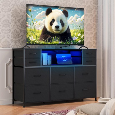 10 Fabric Drawers Dresser, Entertainment Center TV Stand with Power Outlet & LED Light for 45"-55" TV, Chest of Drawers with Wood Top for Bedroom