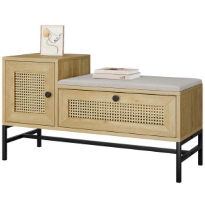 PVC Rattan Shoe Bench with Cabinet Door, Gray Oak Finish