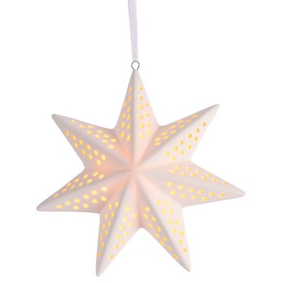 Dickson's LED 8-Point Star with Star Shaped Cutouts - Ribbon Hanger- 4 Inch White Porcelain Decorative Hanging Ornament