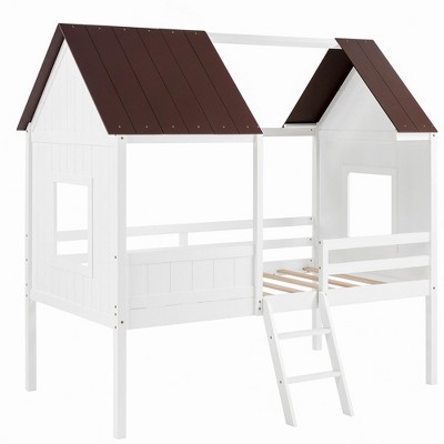 GDFStudio Osha Modern House Bed with Low-Profile Stairs, Window and Bookcase