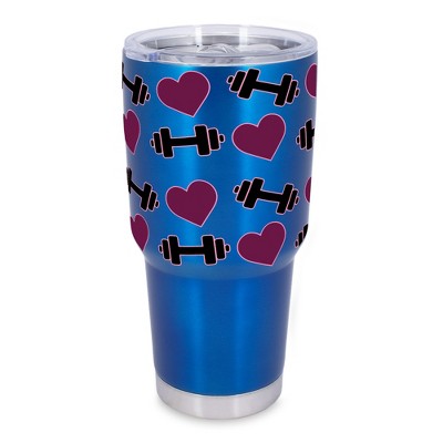 100 North 30 Ounce Stainless Steel On the Go Travel Tumbler With Push Top Lid, Hearts and Weights Blue