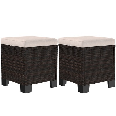 2 Piece Wicker Outdoor Ottomans with Cushions, Rattan Ottoman Footrest and Side Table for Patio, Poolside