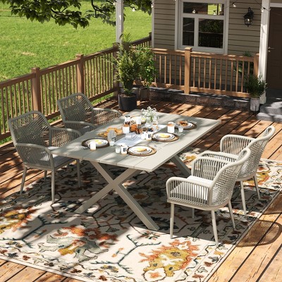 From compact small space patio dining sets to large 7-piece outdoor dining sets built for family gatherings, there’s a wide variety of options to fit your needs. If you love versatility, an extendable outdoor dining table is an excellent choice. It allows you to maximize seating when guests arrive, then fold back to a smaller footprint for everyday use. For cozier setups, a round outdoor dining table set creates a more intimate, conversational atmosphere.
